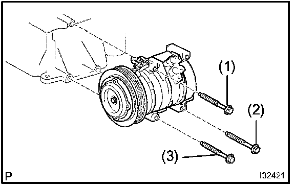 NOTE: Tighten the bolts in the order shown in the illustration to install the compressor and magnetic clutch.