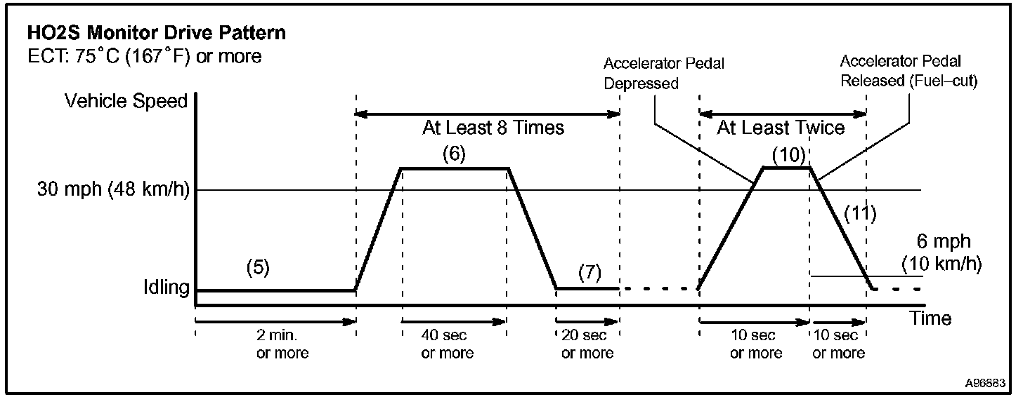 11. Soon after performing step (10) above, release the accelerator pedal for at least 10 seconds without depressing the brake pedal, in order to execute fuel-cut control.