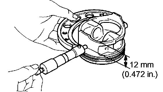 Using a micrometer, measure the piston diameter at right angles to the piston pin hole, and at the piston 12 mm (0.472 inch) from the piston head.