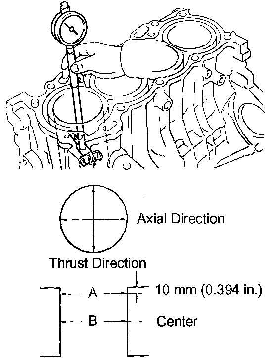Using a cylinder gauge, measure the cylinder bore diameter at positions A and B in the thrust and axial directions.