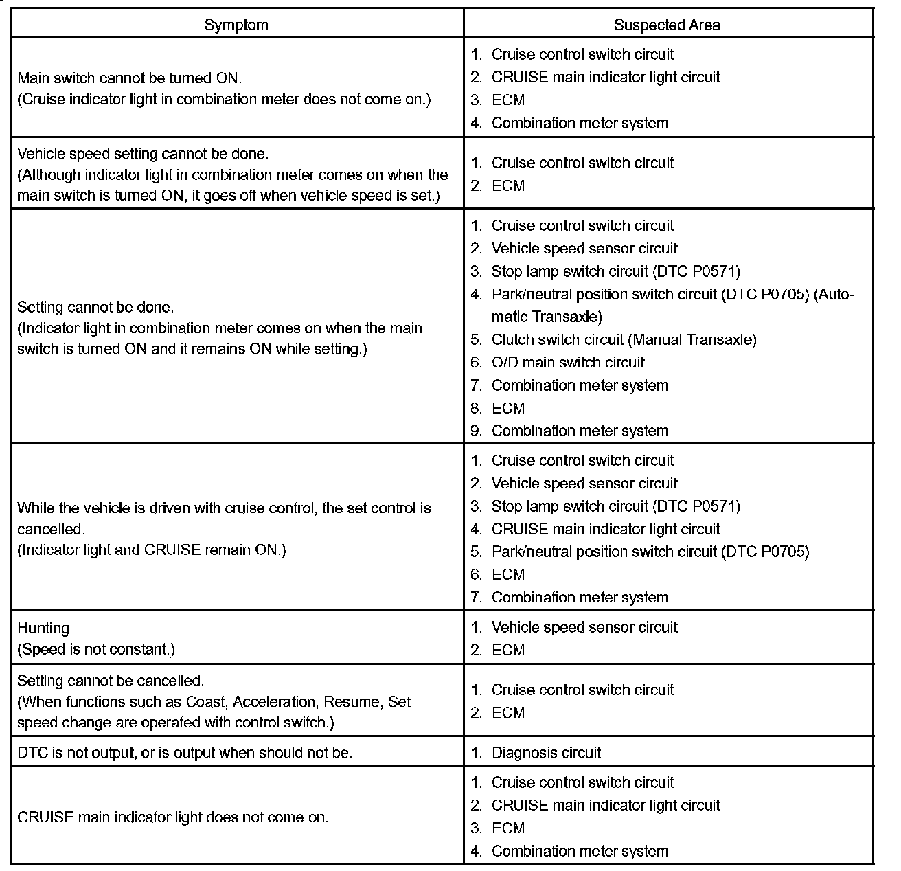HINT: Inspect the "Fuse" and "Relay" before confirming the suspected areas as shown in the table. Inspect each malfunction circuit in numerical order for the corresponding symptom. If the malfunction still exists even after checking and confirming that all the circuits are normal, replace the ECM.