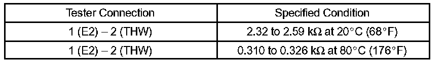 NOTE: If checking the engine coolant temperature sensor in water, be careful not to allow water to intrude into the terminals. After checking, wipe up water on the engine coolant temperature sensor. If the result is not as specified, replace the engine coolant temperature sensor.