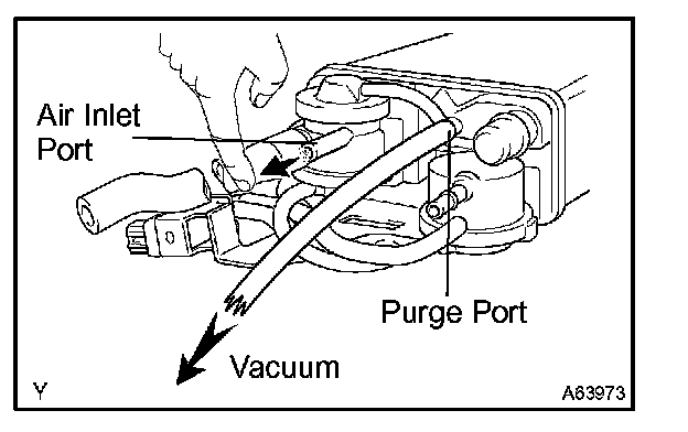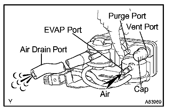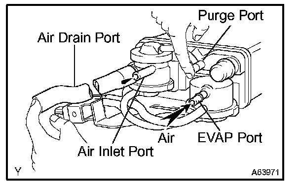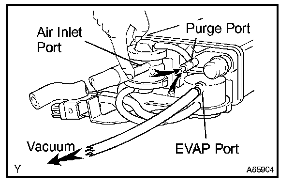 5. While holding the air inlet port closed, apply vacuum 3.43 kPa (25.7 mmHg, 1.01 in.Hg) to the EVAP port and check that the air flows into the purge port.