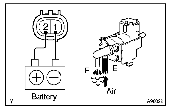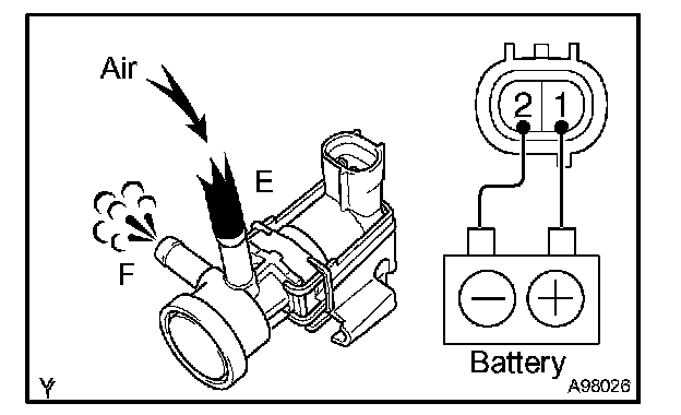1. Check that air does not flow from port E to port F. If the operation is not as specified, replace the VSV.