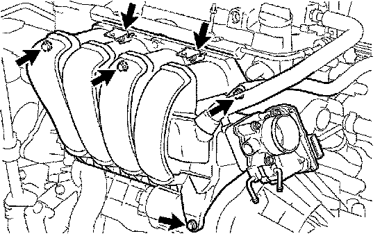 Install the intake manifold and throttle body with the 2 brackets, 4 bolts and 2 nuts.