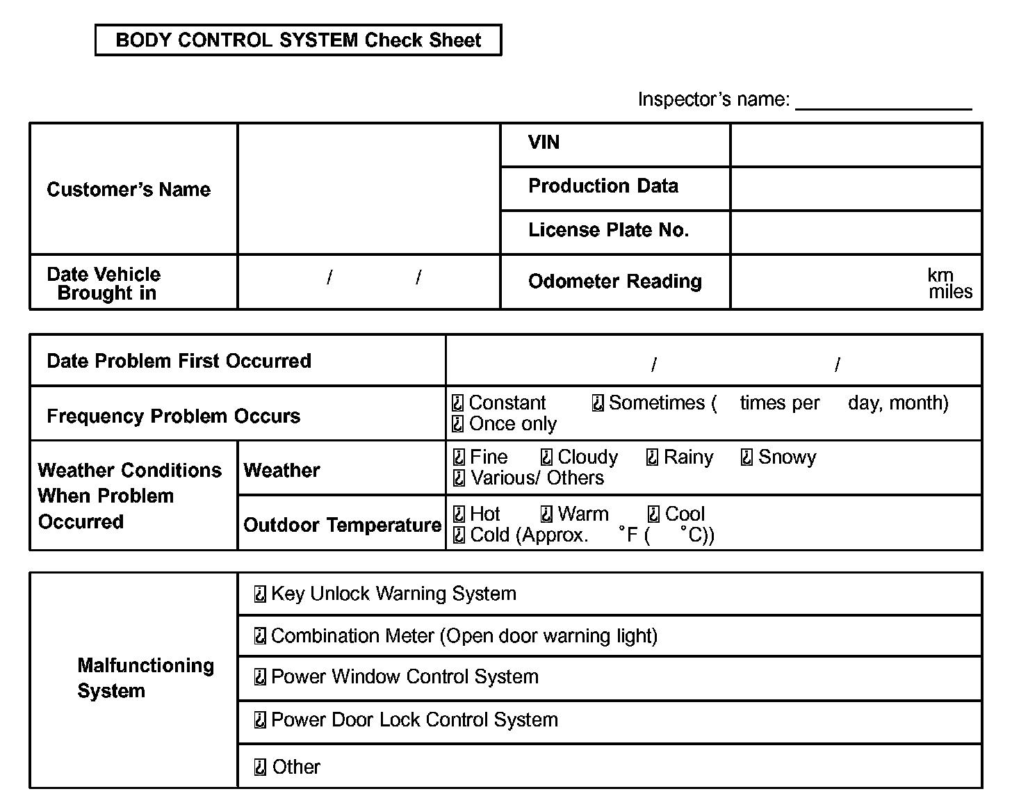 Body Control System Check Sheet: