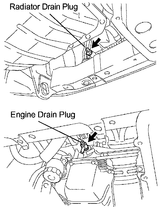 b. Loosen the radiator drain plug (on the left side of the radiator lower tank) and engine drain plug, and drain the coolant.