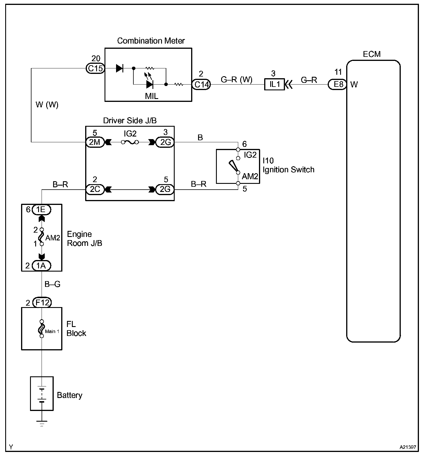 The instrument panel IG2 fuse provides circuit power and the ECM provides the circuit ground that illuminates the MIL.
