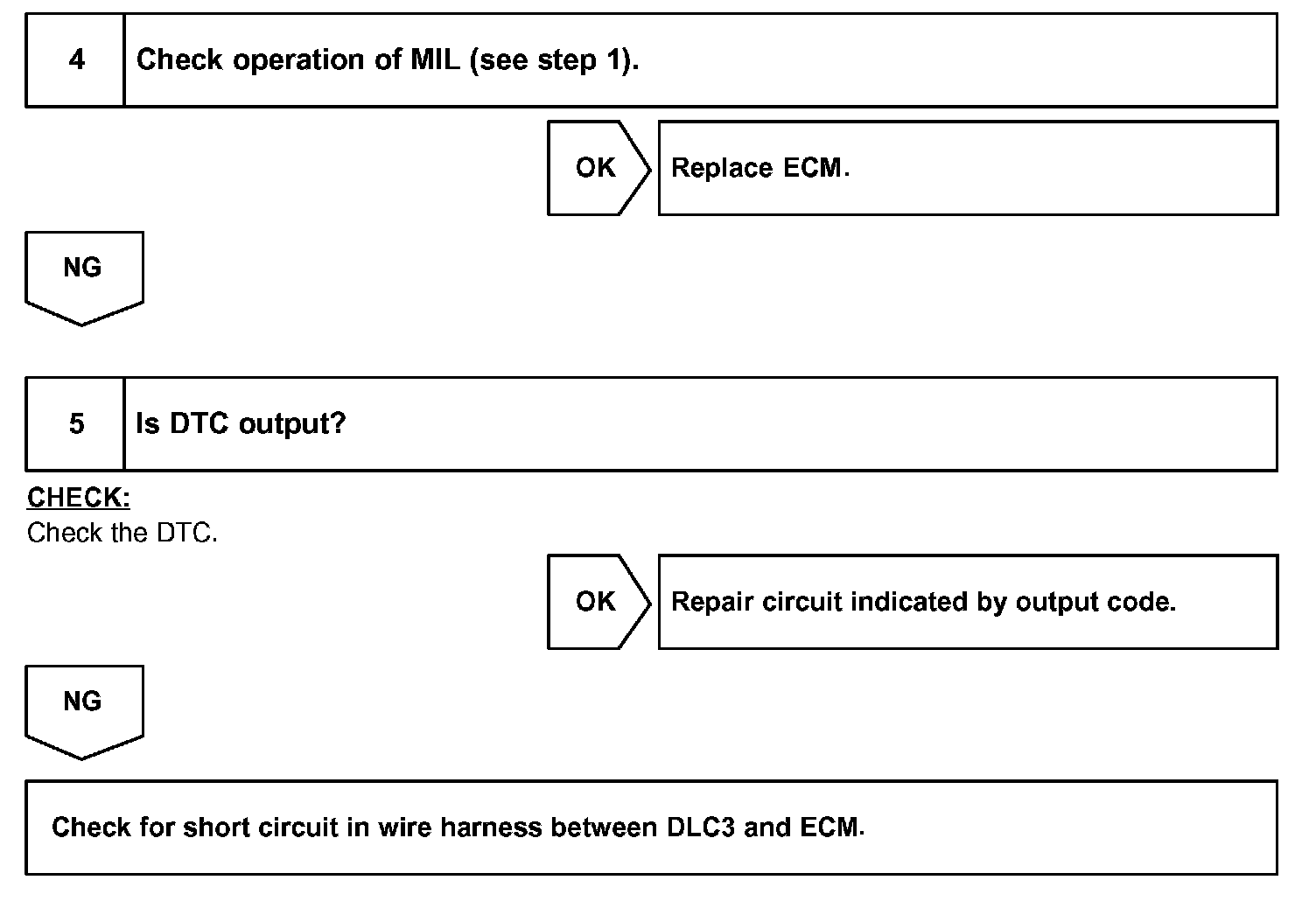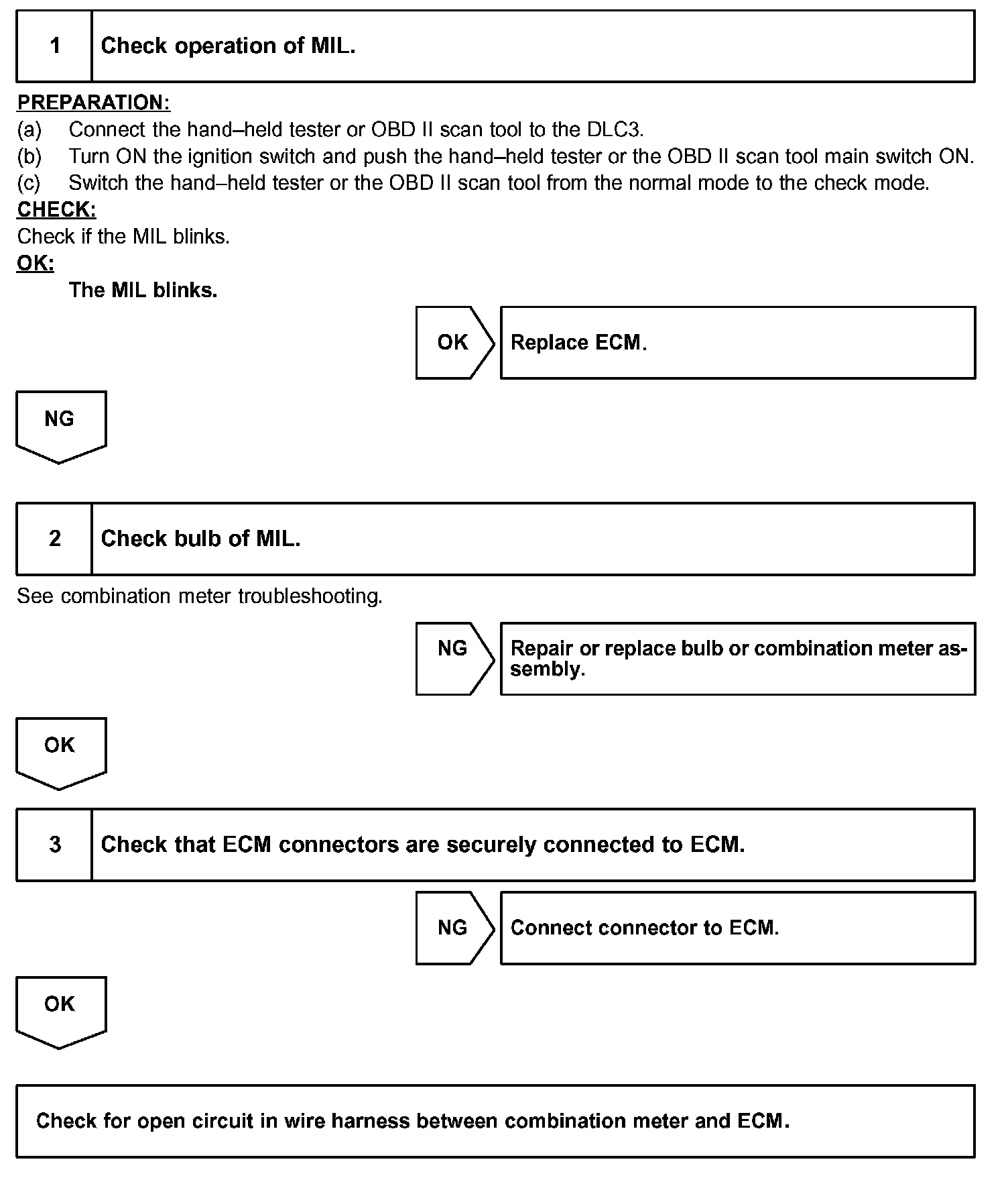 The MIL should be illuminated when the ignition is first turned ON. If the MIL is always ON or OFF, use the hand-held tester or OBD II scan tool and follow the procedures to determine the cause of problem.