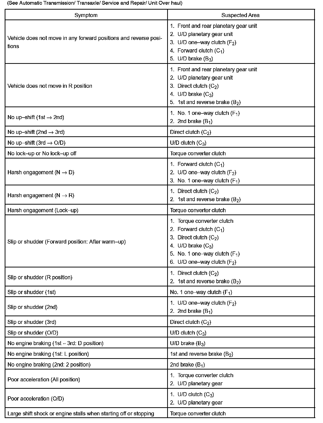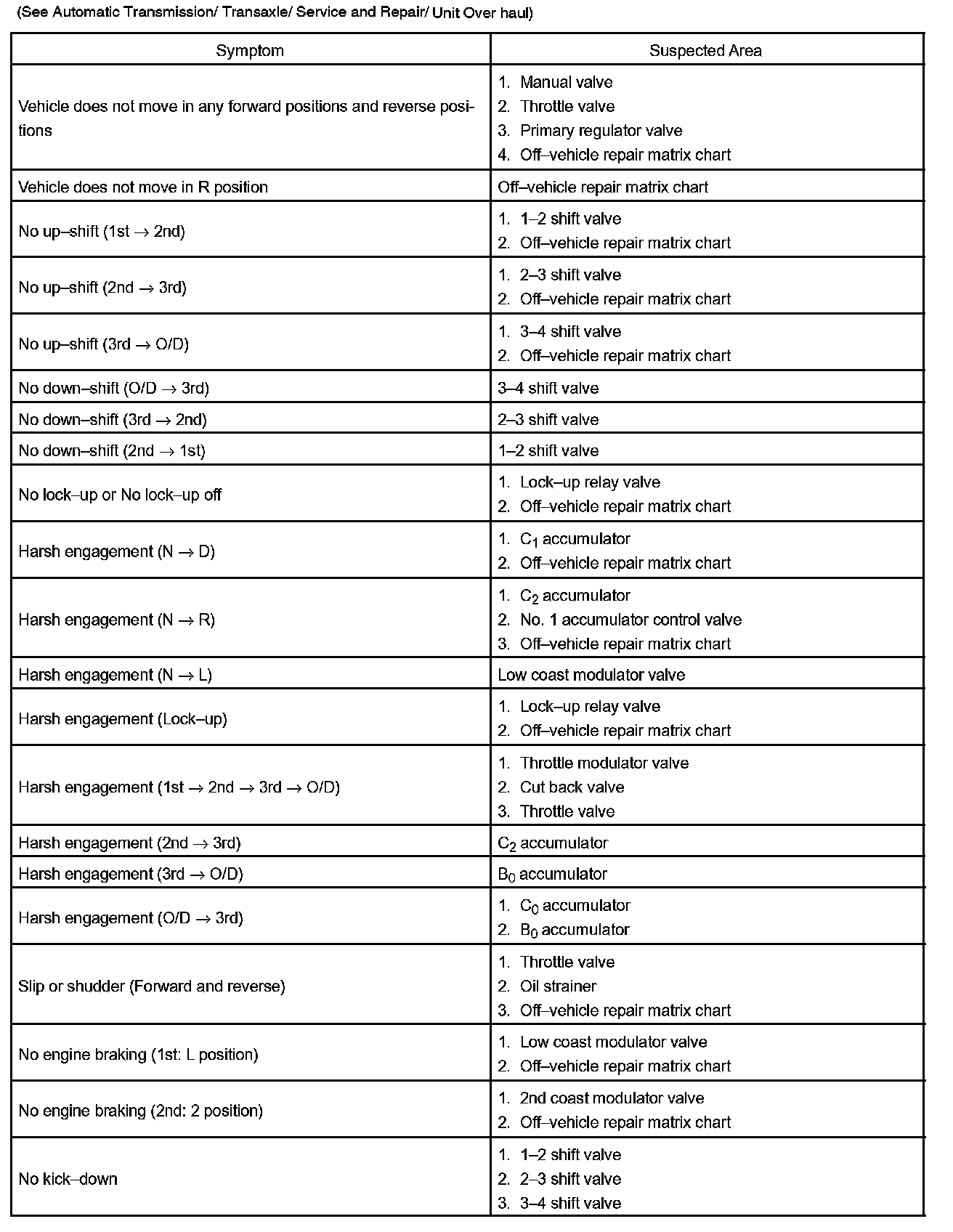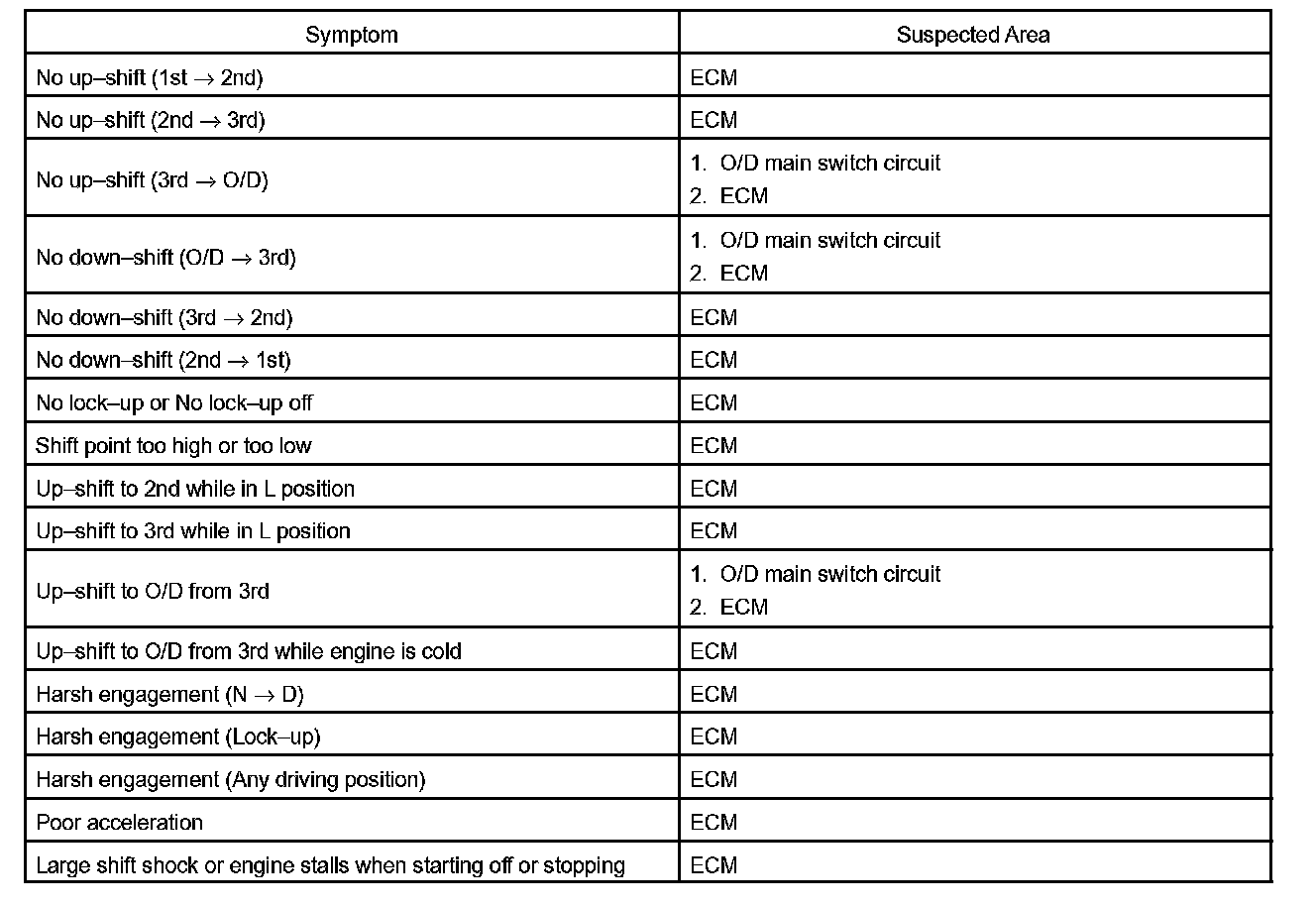 PROBLEM SYMPTOMS TABLEIf a normal code is displayed during the diagnostic trouble code check although the trouble still occurs, check the circuits for each symptom in the order given in the charts and proceed to the given troubleshooting.