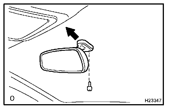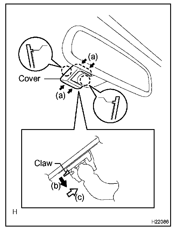 b. Pushing the claw in the (b) direction, slide the inner rear view mirror in the (c) direction and remove it.