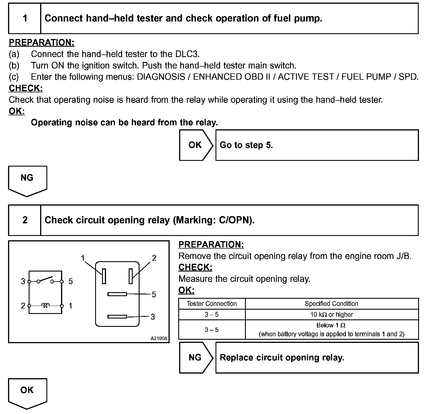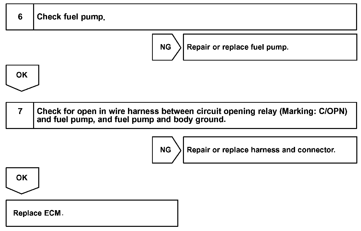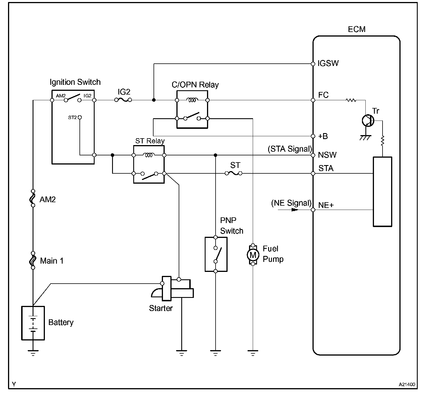 When the STA signal and NE signal are input to the ECM, Tr is turned ON, current flows to coil of the circuit opening relay (Marking: C/OPN), the relay switches ON, power is supplied to the fuel pump and the fuel pump operates.