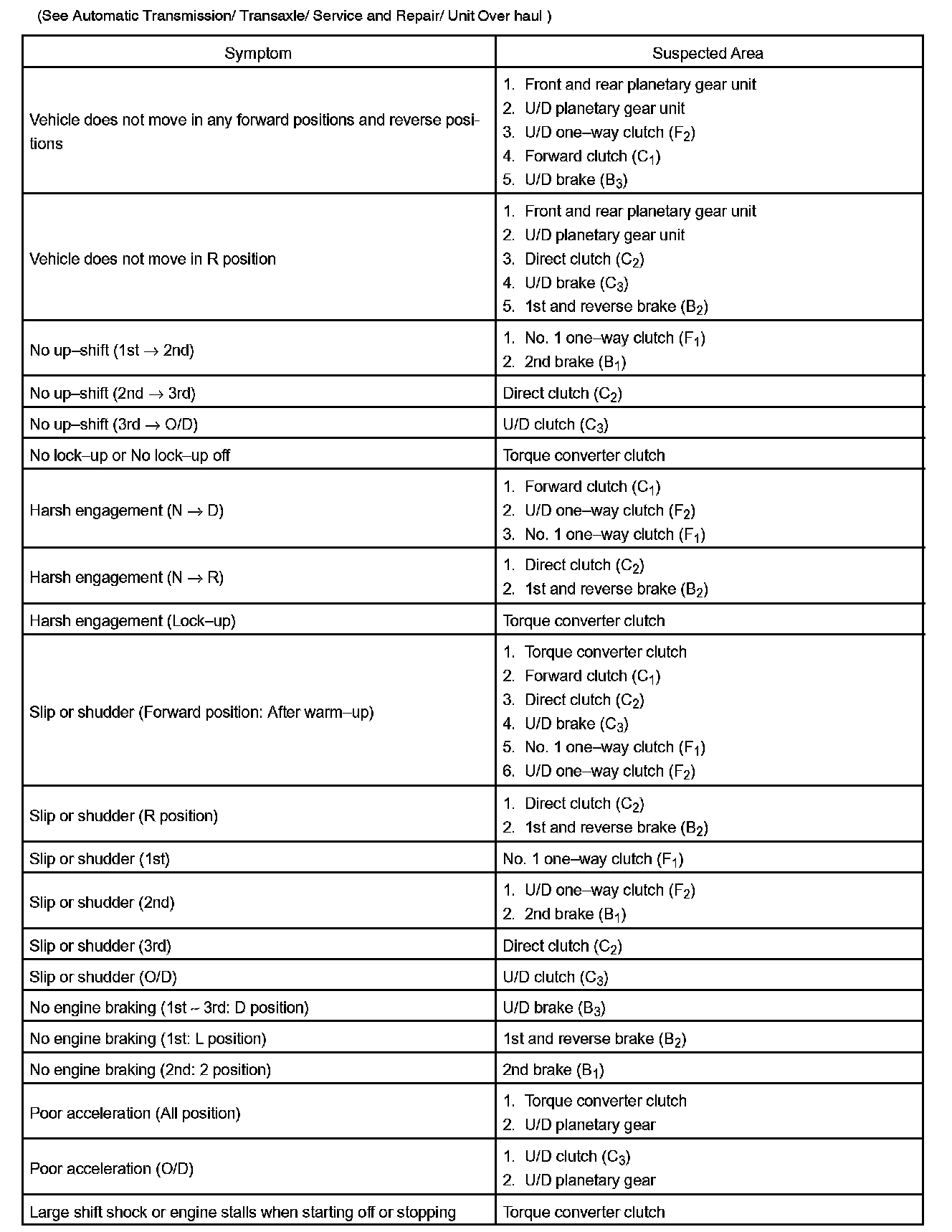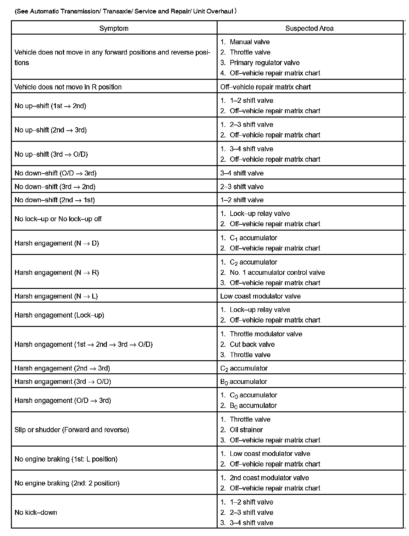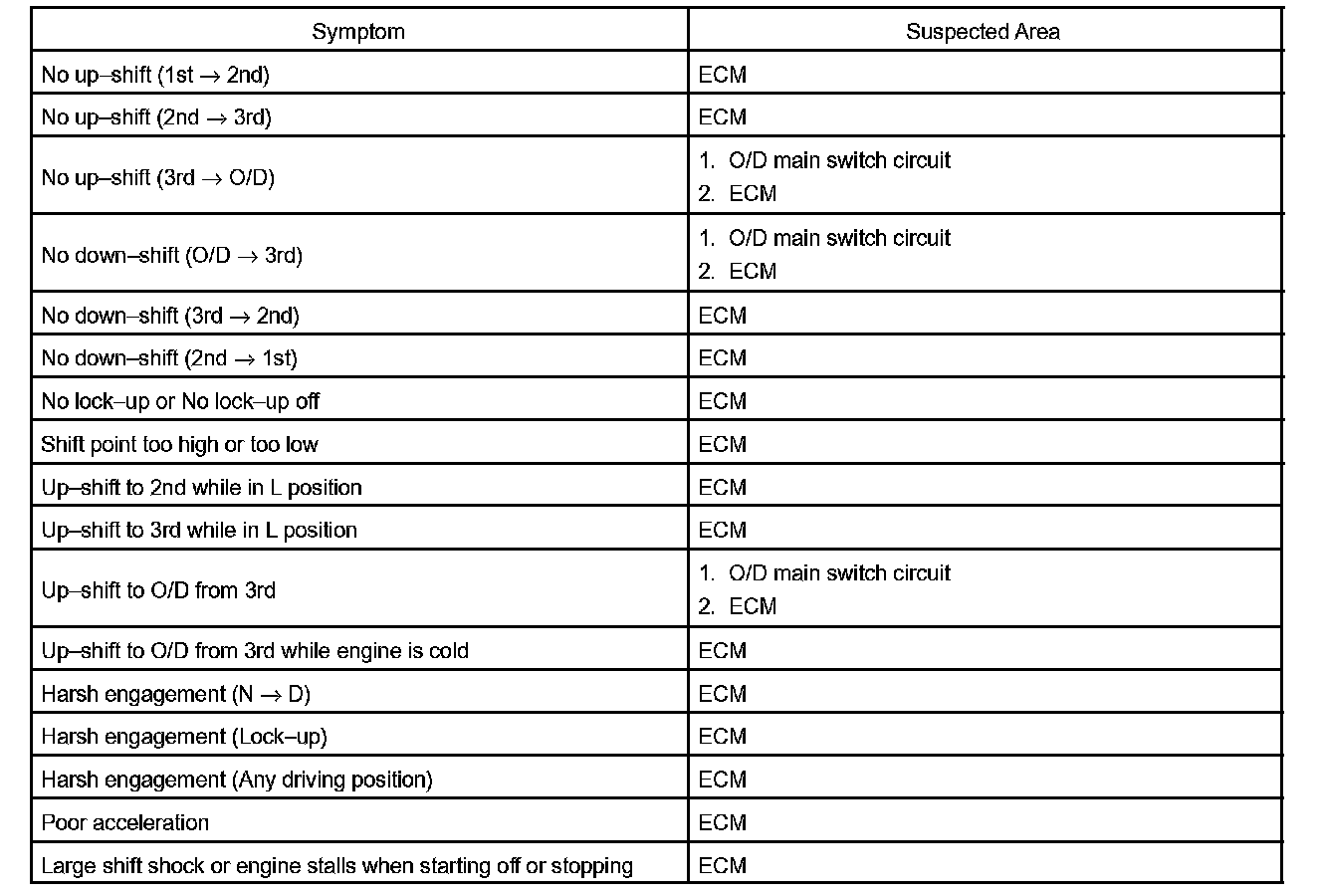 PROBLEM SYMPTOMS TABLEIf a normal code is displayed during the diagnostic trouble code check although the trouble still occurs, check the circuits for each symptom in the order given in the charts and proceed to the given troubleshooting.