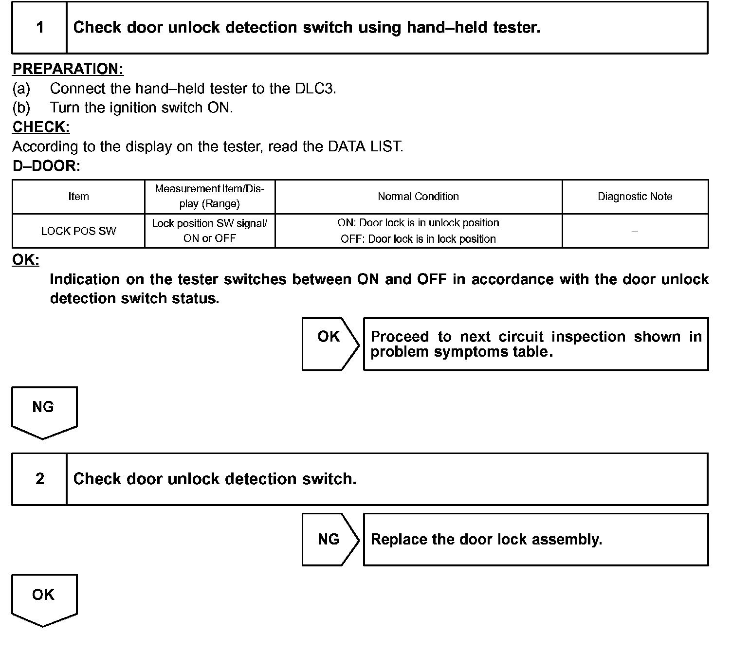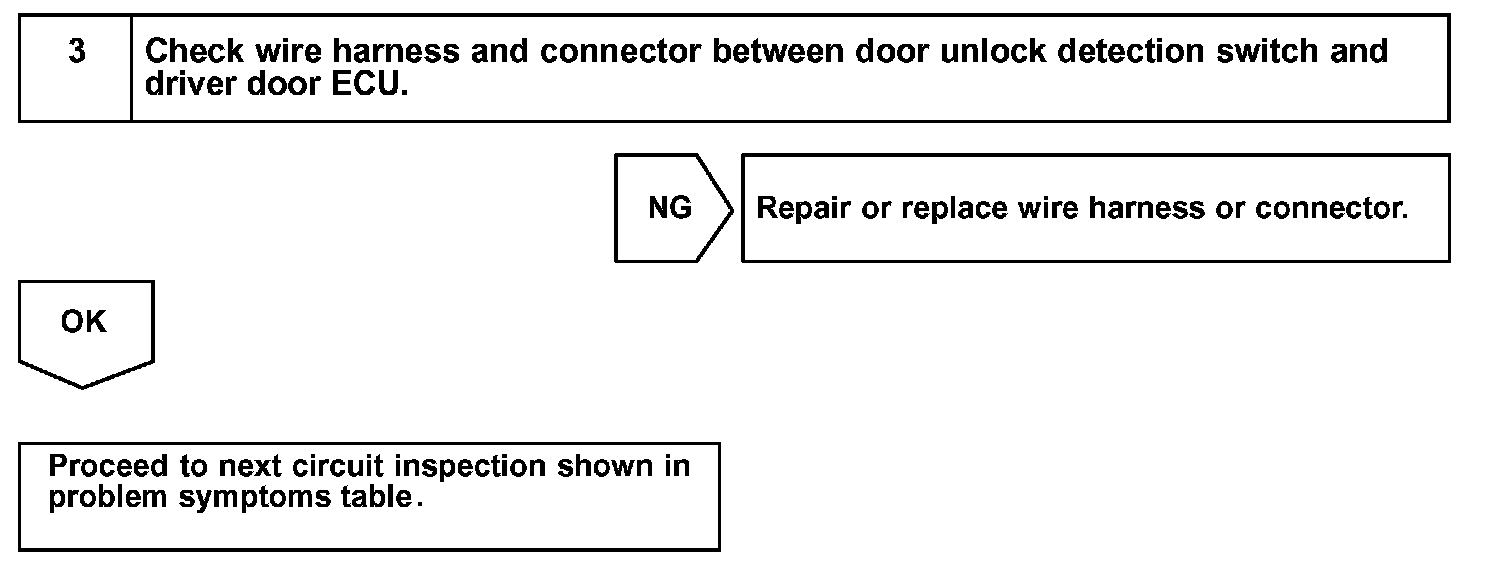 The door unlock detection switch is built in the door lock motor. This switch is ON when the door lock knob is in the unlock position and OFF when the lock knob is in the lock position. The ECU detects the door lock knob conditions in this circuit. It is used as one of the operating conditions for the key confinement prevention function.