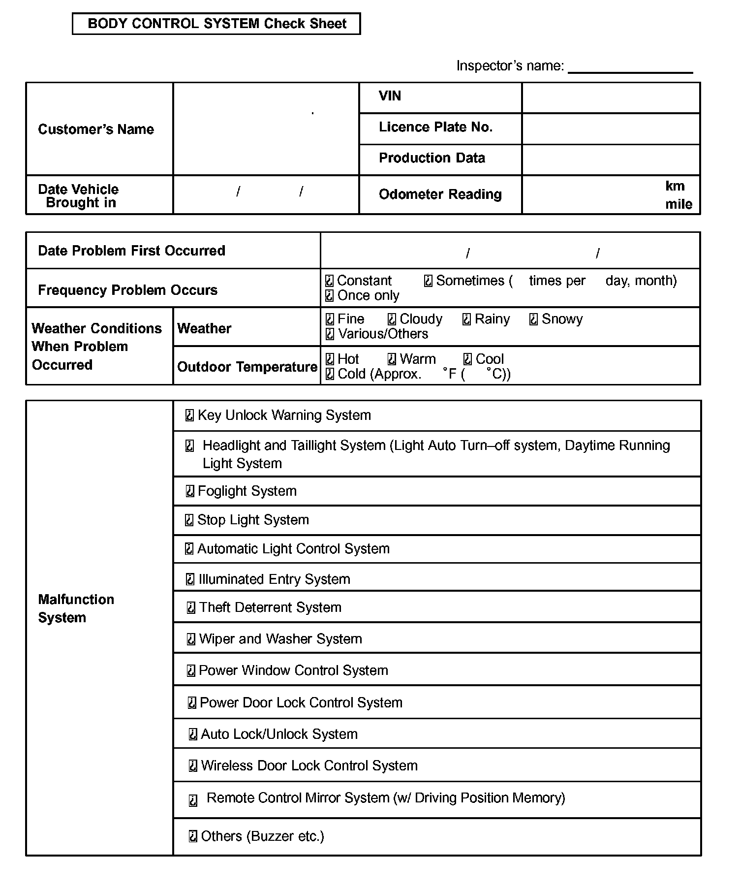 Body Control System Check Sheet: