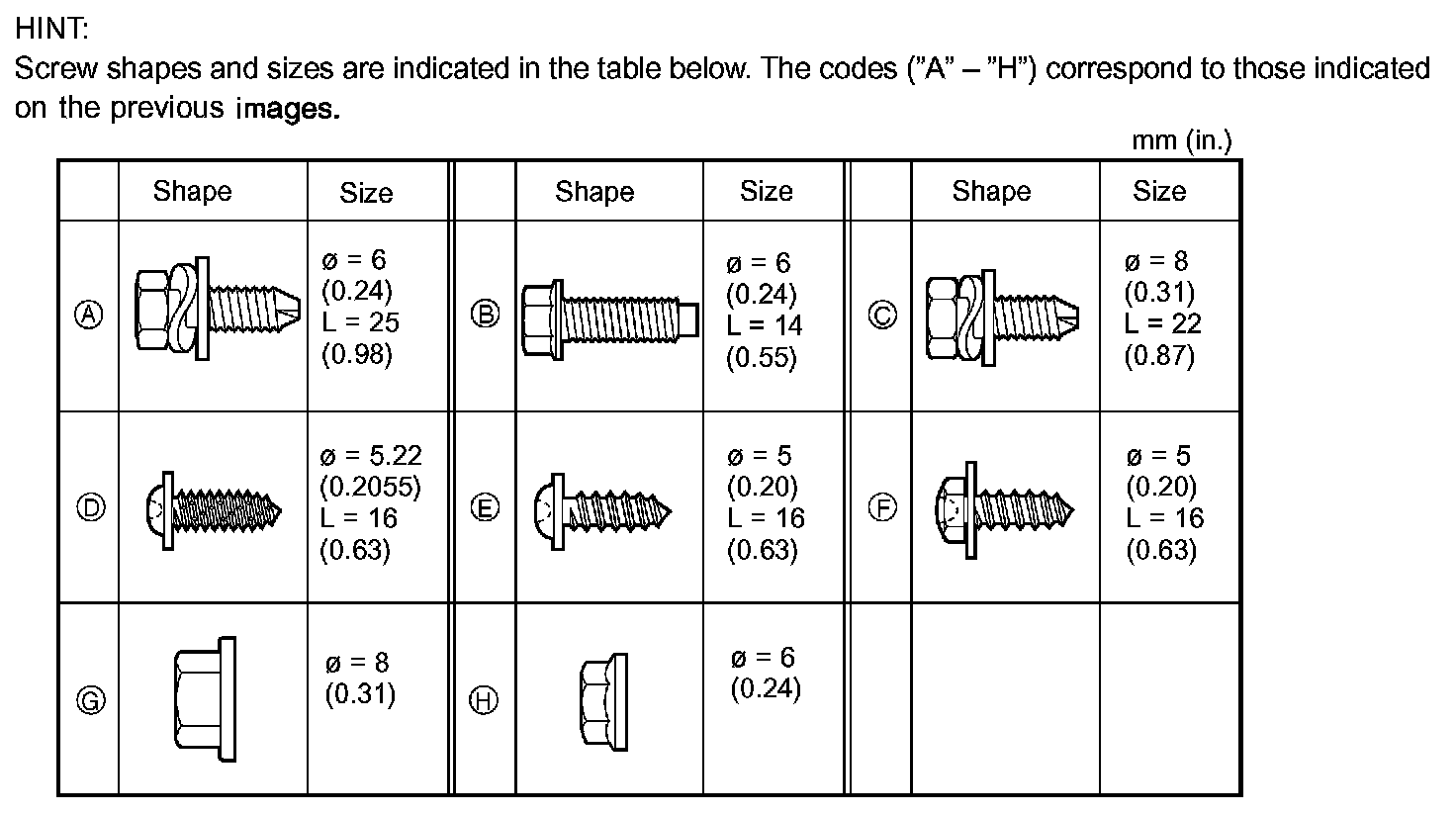 Table Of Fasteners:
