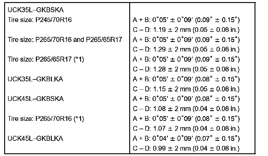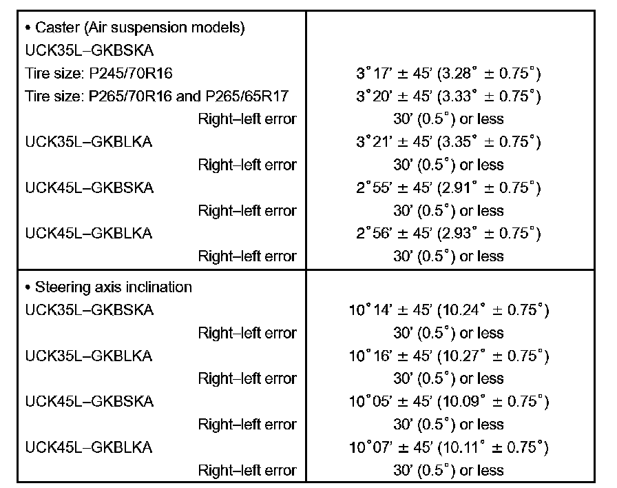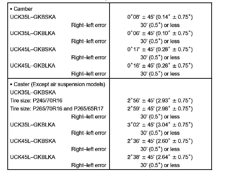 If the steering axis inclination is not within the specified values, after the camber and caster have been correctly adjusted, recheck the steering knuckle and front wheel bearing for looseness.