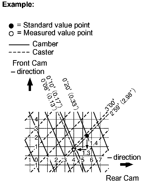 5. As shown in the example chart, read the distance from the measured value to the standard value, and adjust the front and/or rear adjusting cams accordingly.