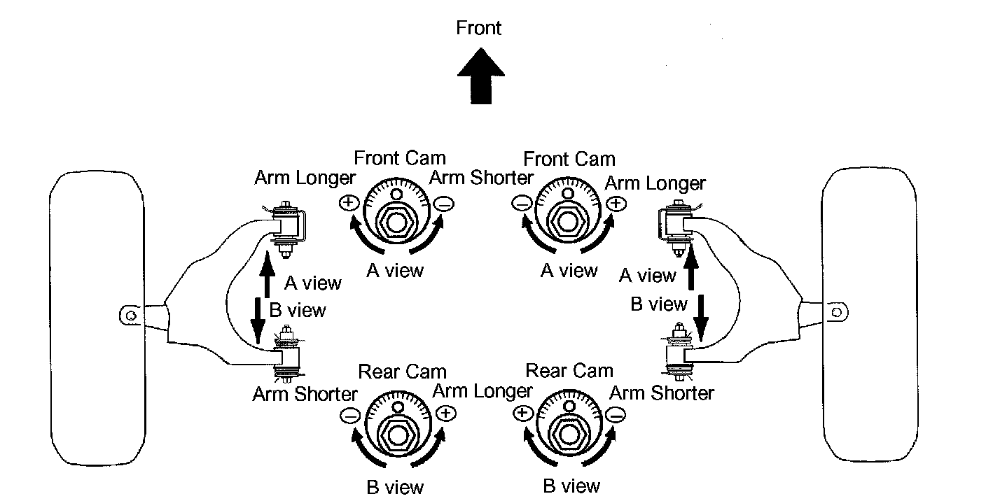 b. Adjust the camber and caster by turning the front and/or rear adjusting cams (See adjustment chart).