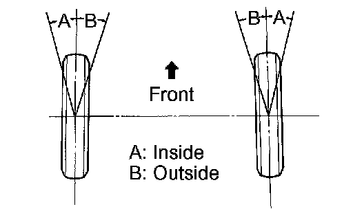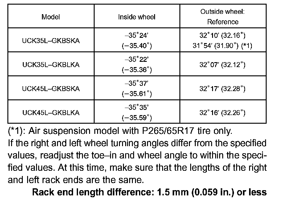 If the right and left wheel turning angles differ from the specified values, readjust the toe-in and wheel angle to within the specified values. At this time, make sure that the lengths of the right and left rack ends are the same.