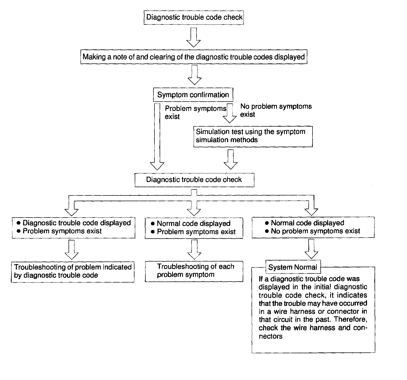 Taking into account the above points, a flow chart showing how to proceed with troubleshooting using the diagnostic trouble code check is shown. This flow chart shows how to utilize the diagnostic trouble code check effectively, then by carefully checking the results, indicates how to proceed either to diagnostic trouble code troubleshooting or to troubleshooting of problem symptoms table.
