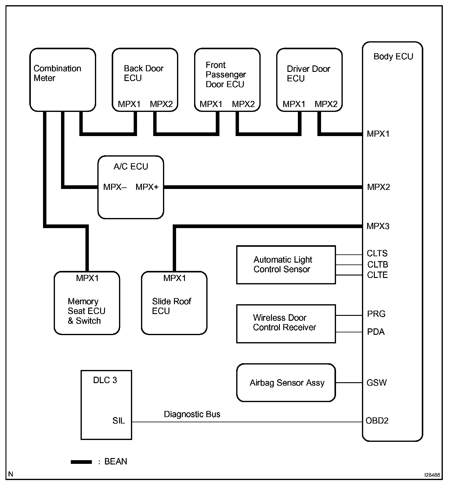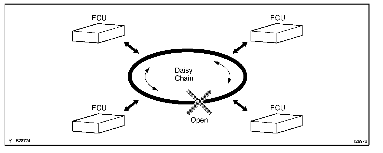 The BEAN (Body Electronics Area Network) uses the ring and bus styles of networks to connect ECUs. This connection style is called a daisy chain. In the daisy chain, communication can be maintained even if there is an area that has an open circuit.