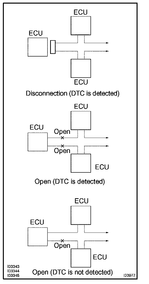 a. If a DTC for an ECU communication stop is indicated, a connector may be disconnected or there may be open circuits on 2 or more communication buses. When there is an open circuit on only 1 communication bus, no DTC will be detected.