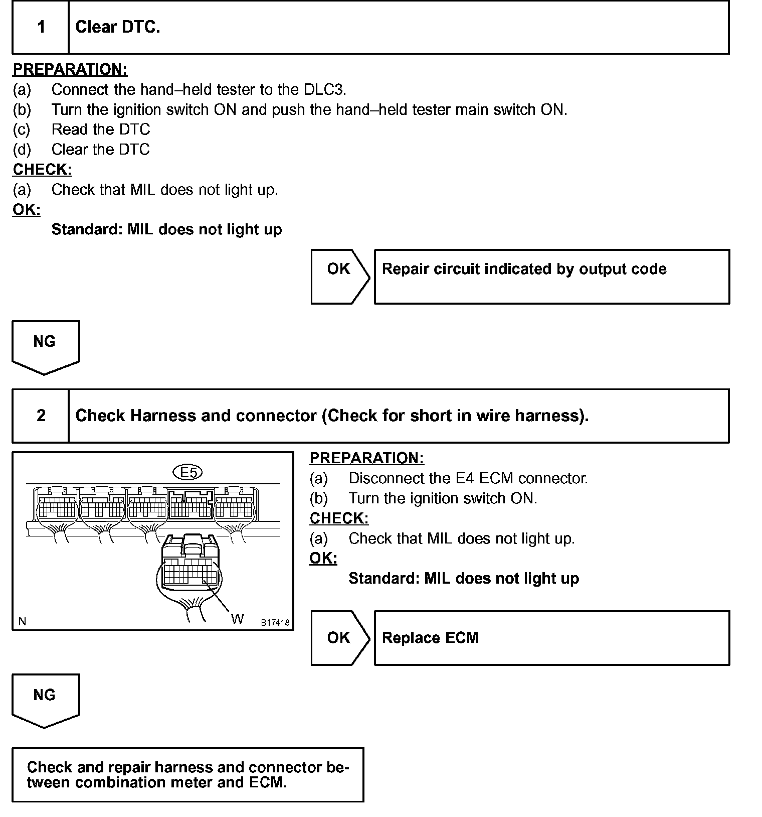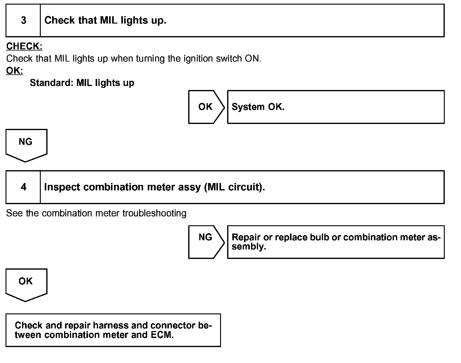 If the ECM detects a trouble, the MIL lights up. At this time, the ECM records a DTC in the memory.