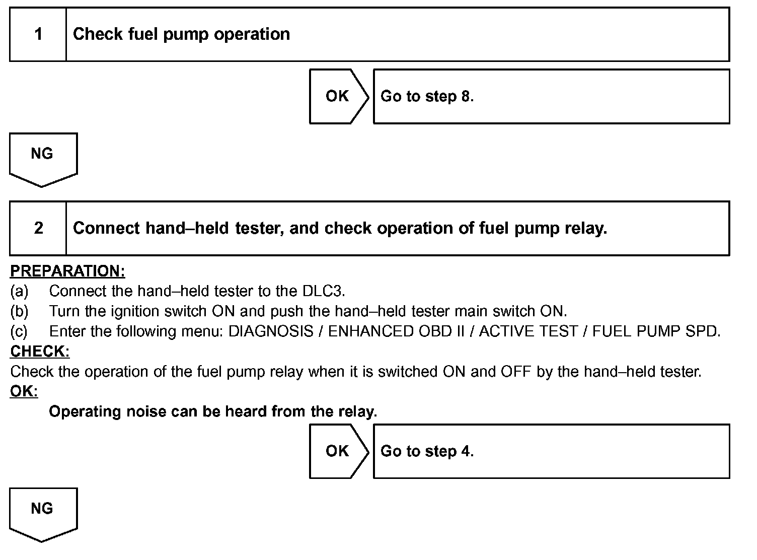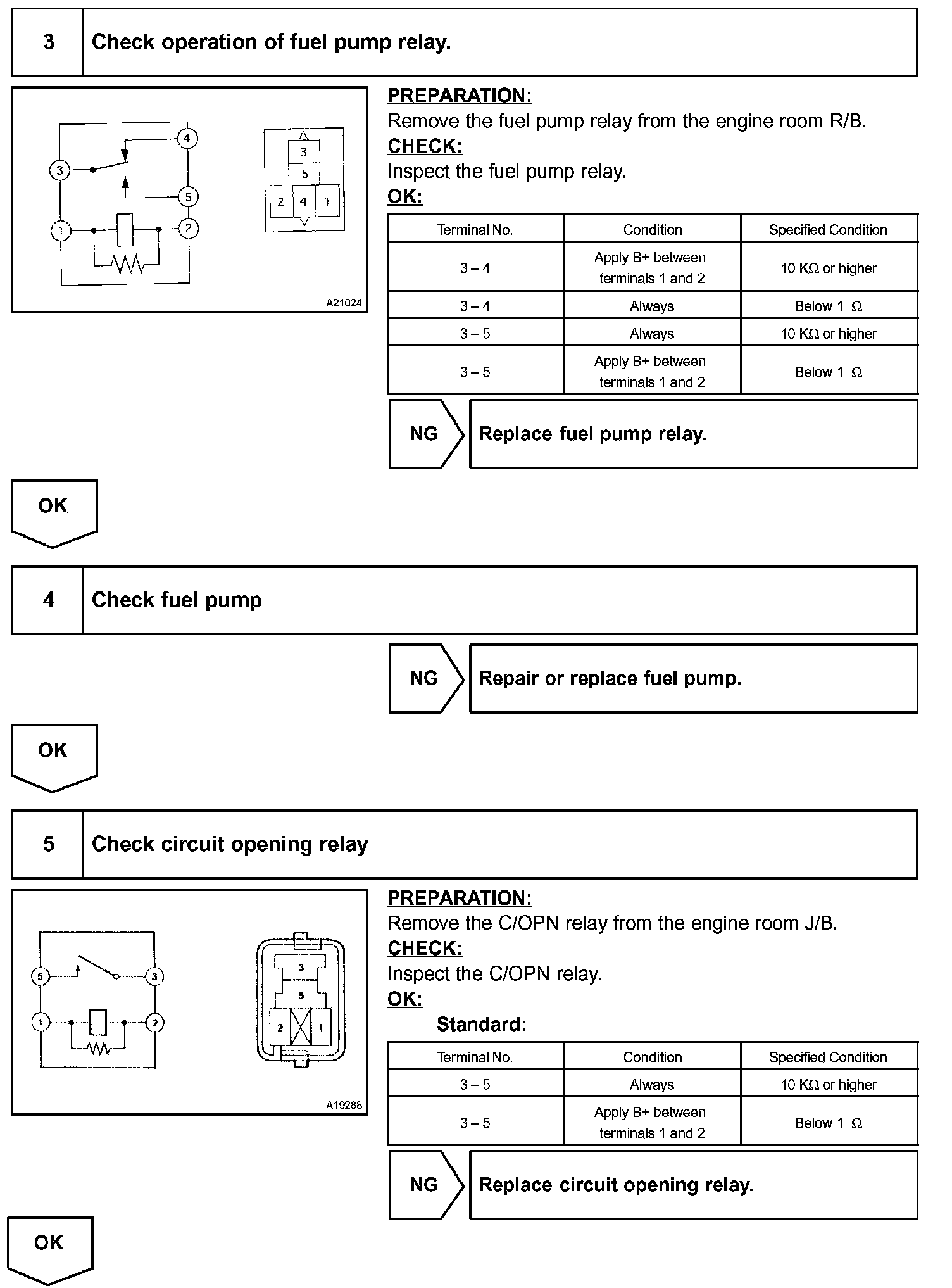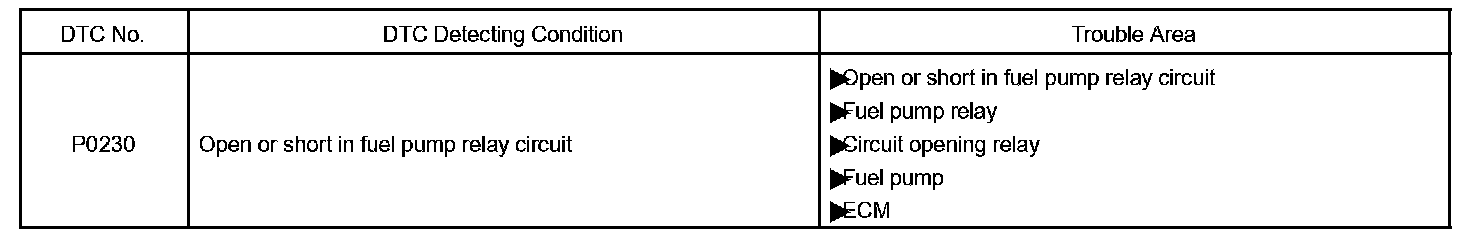 When the STA signal and NE signal are input to the ECM, the Tr1 is turned ON, current flows to the coil of the circuit opening relay, the relay switches on, power is supplied to the fuel pump, and the fuel pump operates.