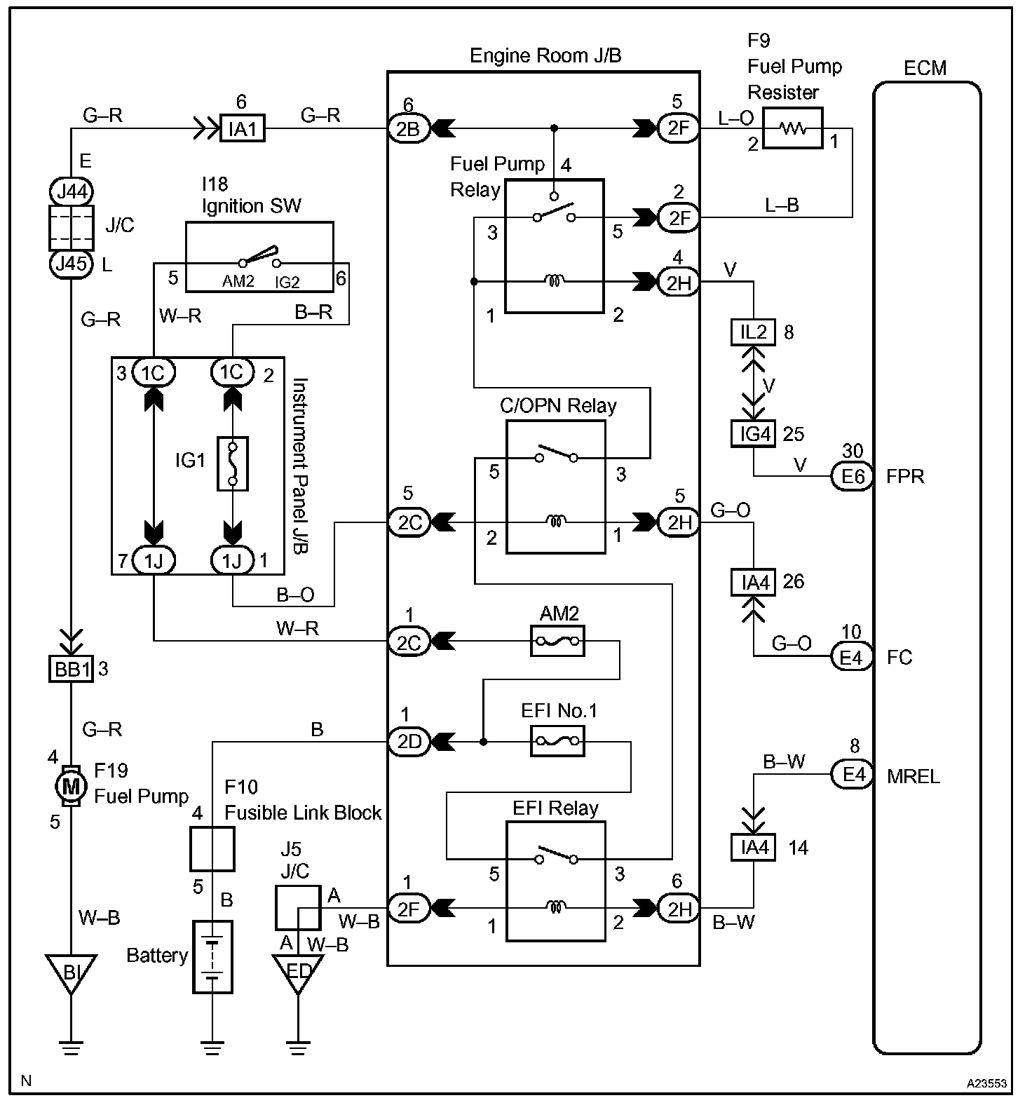 While the NE signal is generated (engine running), the ECM keeps the Tr1 ON (circuit opening relay ON) and the fuel pump also keeps operating.