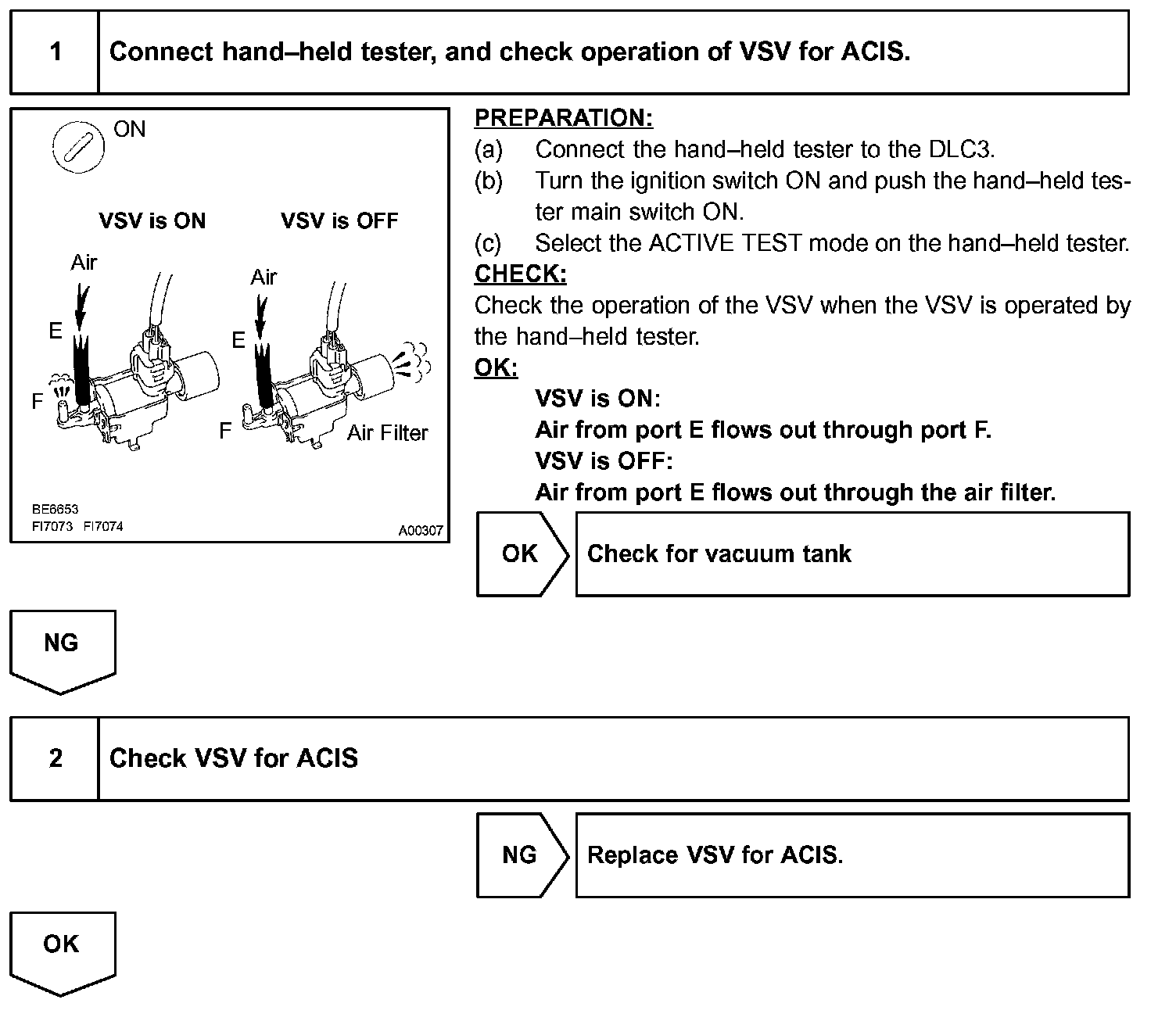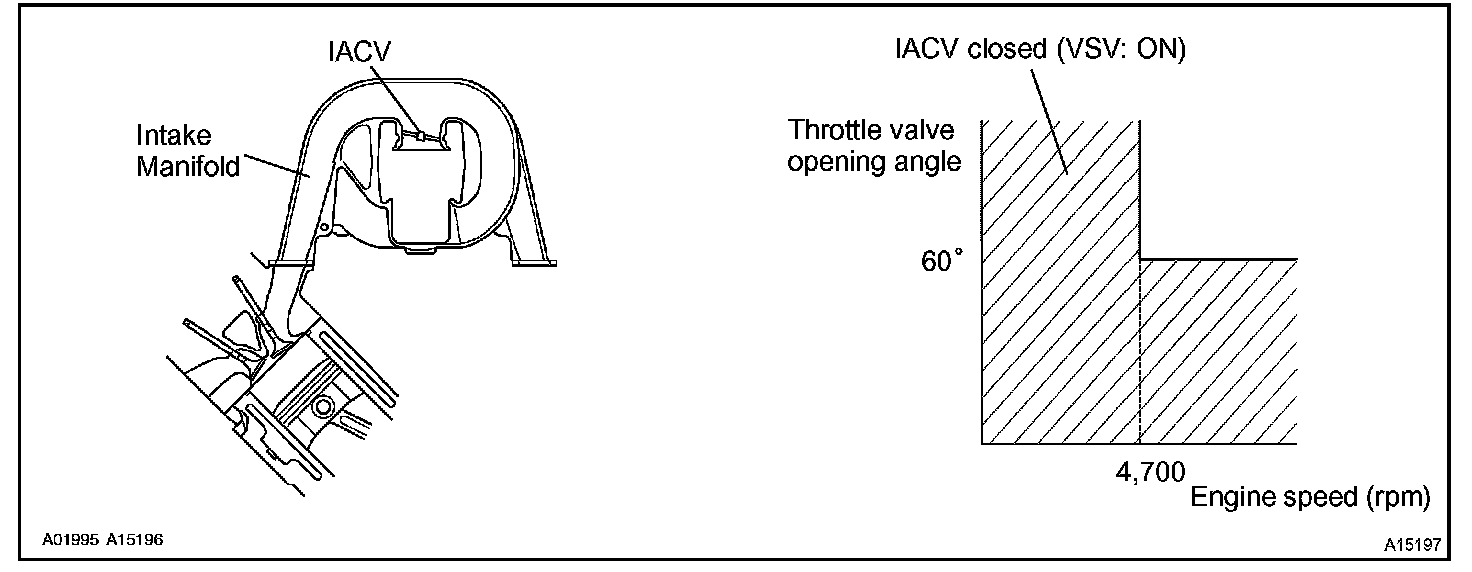When the engine speed is 4,700 rpm or more and the throttle valve opening angle is 60 ° or more, the VSV is OFF, so the is IACV open. All the other times, the ECM turns the VSV ON and closes the IACV.