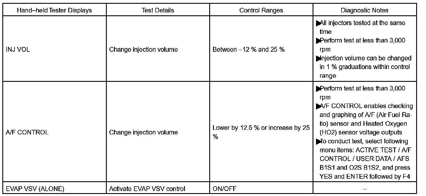 HINT: Performing an ACTIVE TEST enables components including the relays, VSV (Vacuum Switching Valve), and actuators, to be operated without removing any parts. The ACTIVE TEST can be performed with a hand-held tester. Performing an ACTIVE TEST as the first step of troubleshooting is one method of shortening diagnostic time.