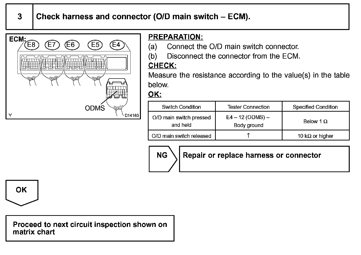 The O/D main switch (transmission control switch) is a momentary type switch. When pressing the O/D main switch once, the O/D OFF indicator light comes on and the ECM prohibits shifting into O/D. When pressing it once again, the O/D OFF indicator light goes off and the ECM allows shifting into O/D. Turning the IG switch OFF will reset the O/D OFF indicator light.