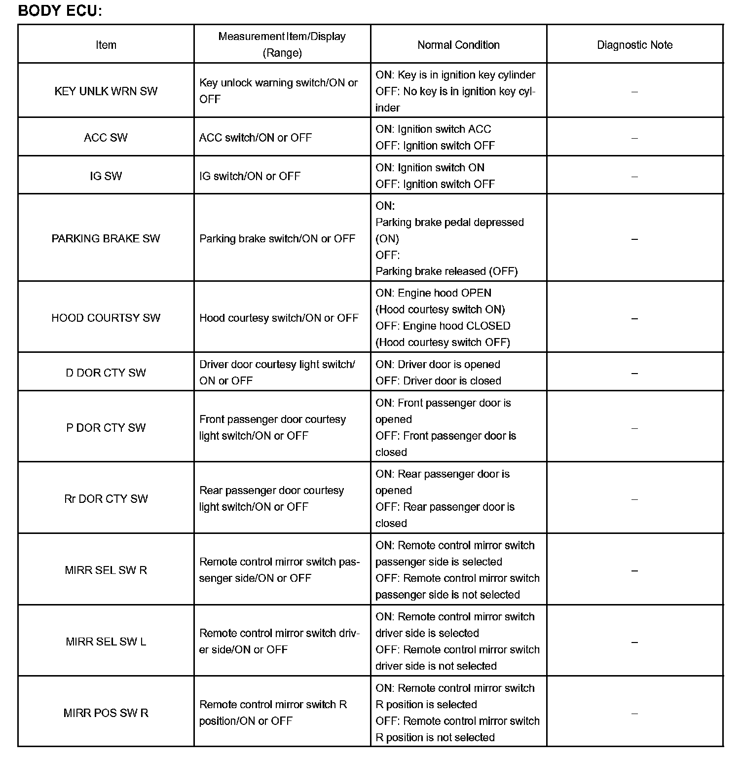 DATA LISTHINT: According to the DATA LIST displayed by the hand-held tester, you can read the values of the switches, sensors, actuators and so on without parts removal. Reading the DATA LIST as a first step of troubleshooting is one of the methods to shorten labor time.