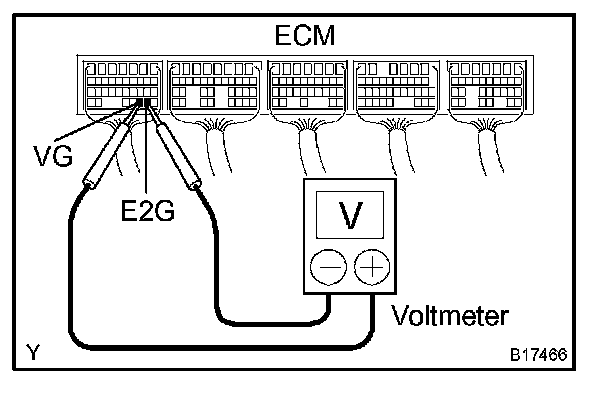 2. Connect the positive tester probe of the voltmeter to terminal VG of the ECM and the negative tester probe of the voltmeter to terminal E2G of the ECM.