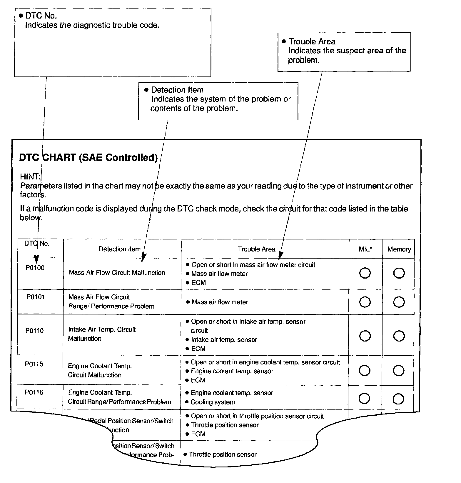 DIAGNOSTIC TROUBLE CODE CHARTThe inspection procedure is shown in the table. This table permits efficient and accurate troubleshooting using the diagnostic trouble codes displayed in the diagnostic trouble code check. Proceed with troubleshooting in accordance with the inspection procedure given in the diagnostic chart corresponding to the diagnostic trouble codes displayed. The engine diagnostic trouble code chart is shown as an example.
