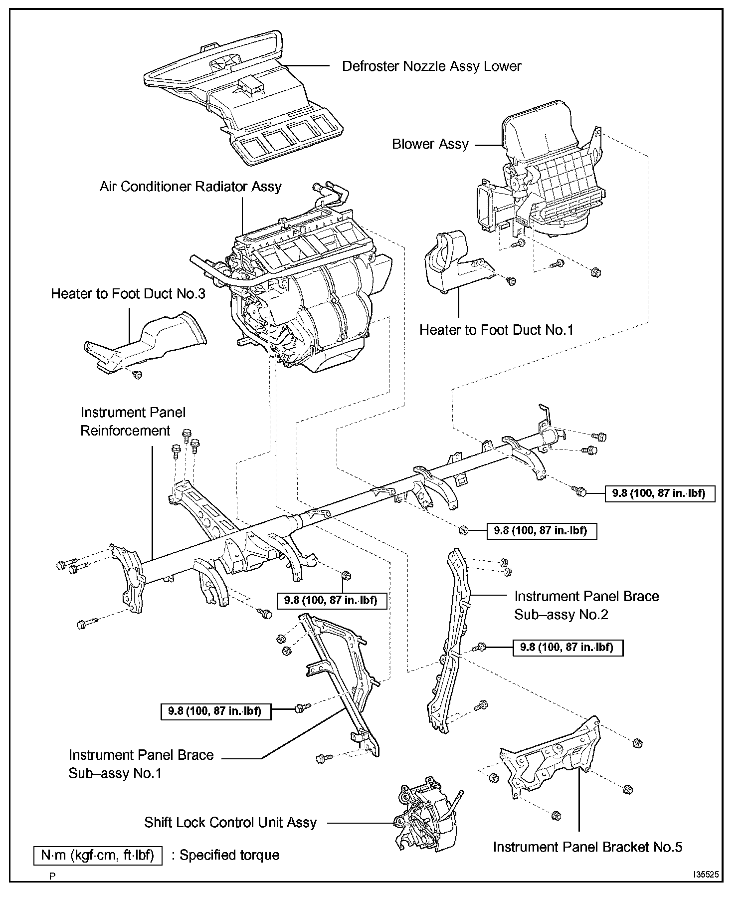 b. Remove the 3 bolts, the 2 nuts and the instrument panel brace sub-assembly No.1.