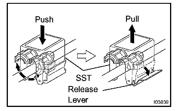 c. Pull SST slightly and push the release lever, and then remove the piping clamp with SST.