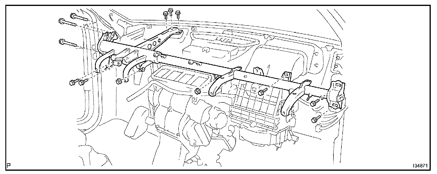 d. Remove the 11 bolts, 2 nuts and the instrument panel reinforcement.