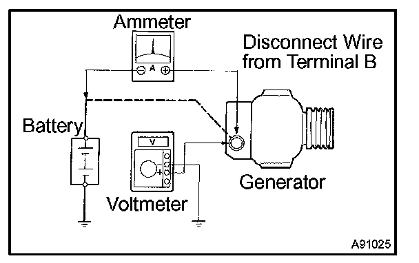 1. Disconnect the wire from terminal B of the generator and connect it to the negative (-) lead of the ammeter.