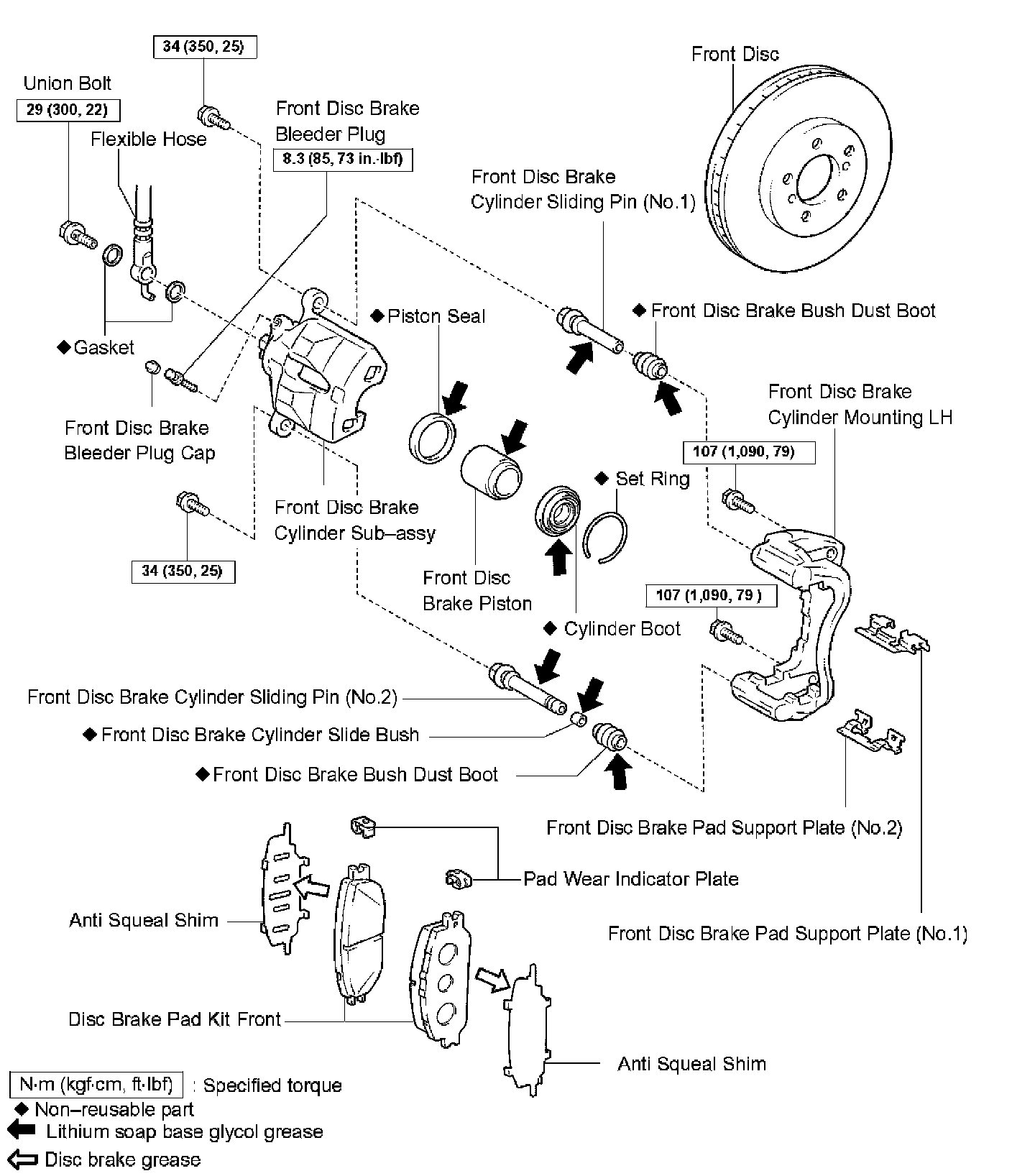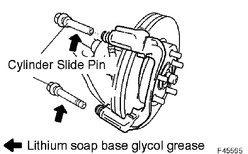 a. Apply lithium soap base glycol grease to a new front disc brake cylinder slide bush.