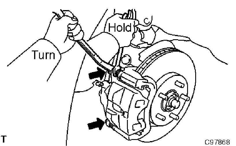 a. Hold the front disc brake cylinder slide pin (No. 1), side pin (No.2) and remove the 2 bolts.