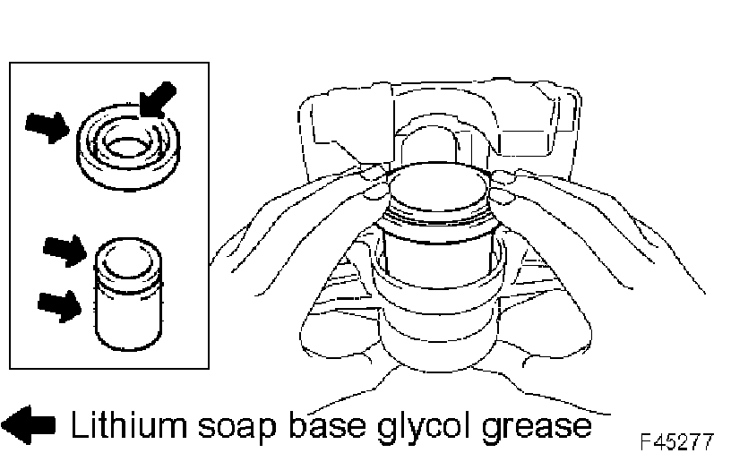 c. Apply lithium soap base glycol grease to the sealing surface of 2 new front disc brake bush dust boots.