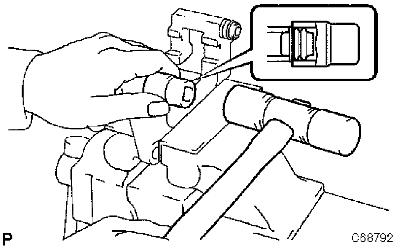 d. Using a socket wrench (19 mm) and hammer, drive the 2 front disc brake bush dust boots to the front disc brake cylinder mounting LH.