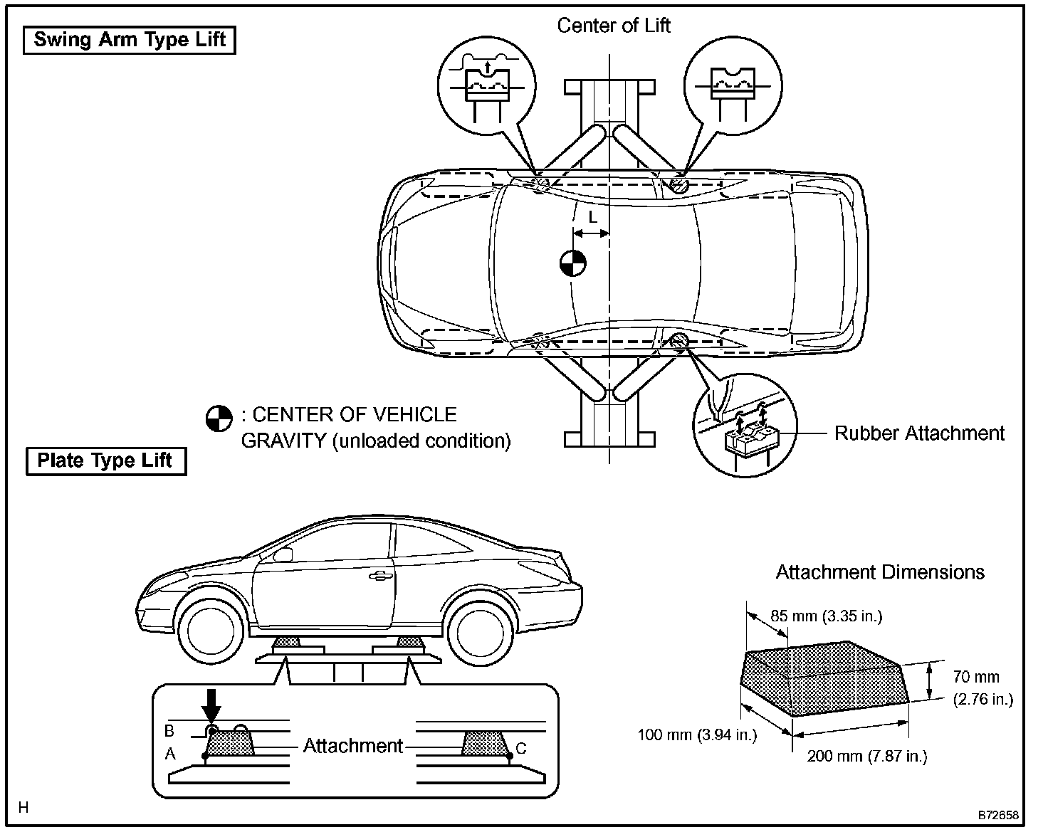 d. Set the vehicle on the lift as level as possible. Then match the groove of the cradle to the rigid rack support location.