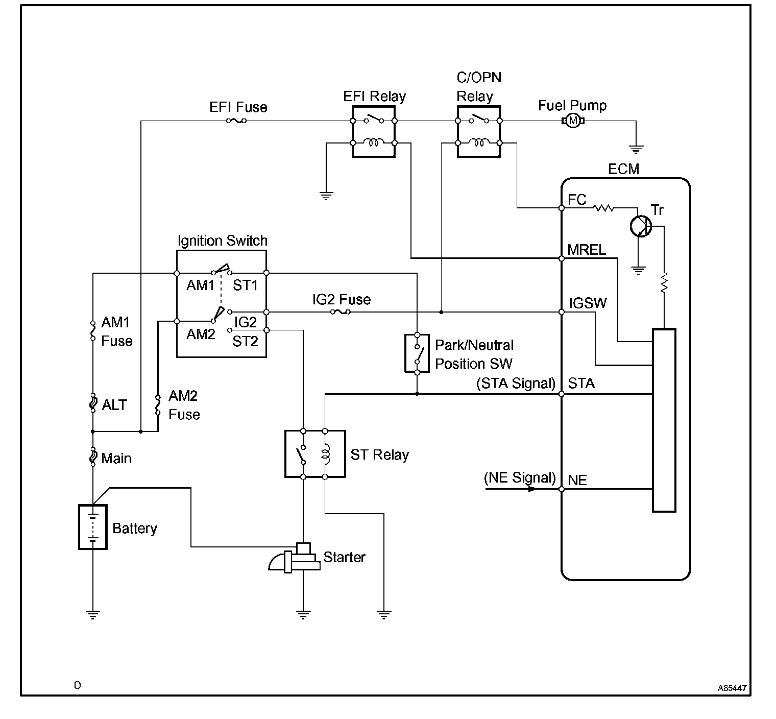 When the STA signal and NE signal are input to the ECM, Tr is turned ON, current flows to coil of the circuit opening relay (marking: C/OPN), the relay switches ON, power is supplied to the fuel pump and the fuel pump operates.