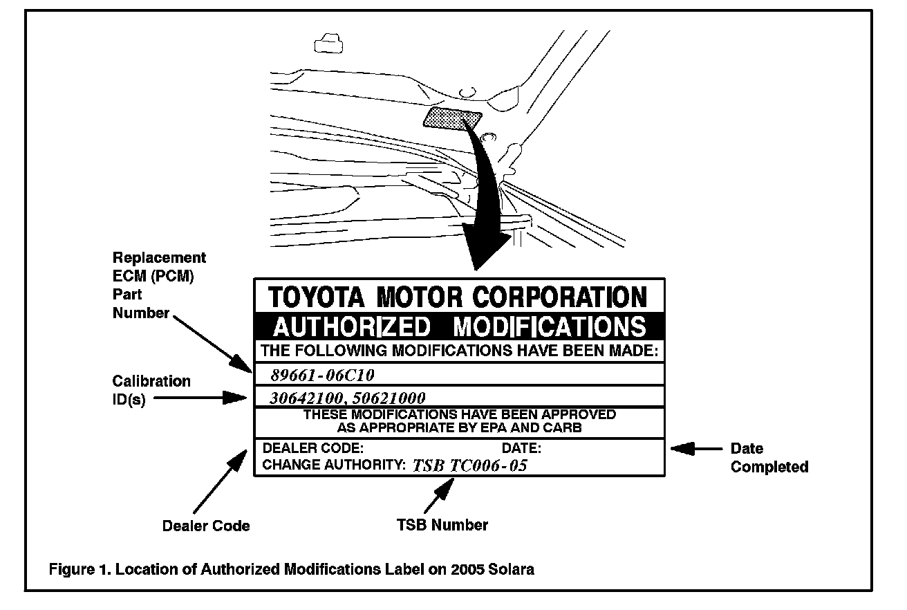 1. Check for the Authorized Modifications Label affixed to the vehicle in the location shown in Figure 1. Confirm if ECM (PCM) calibration has been updated. If not the latest ECM (PCM) calibration go to step 2.