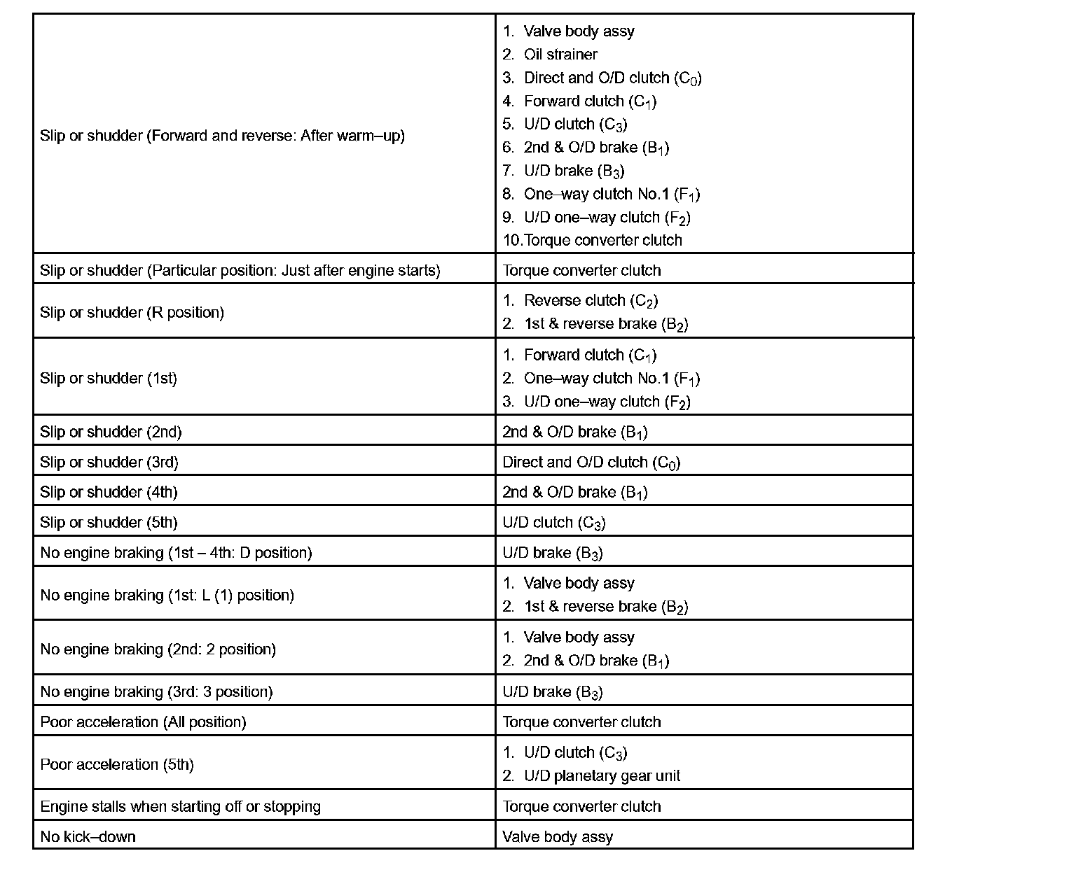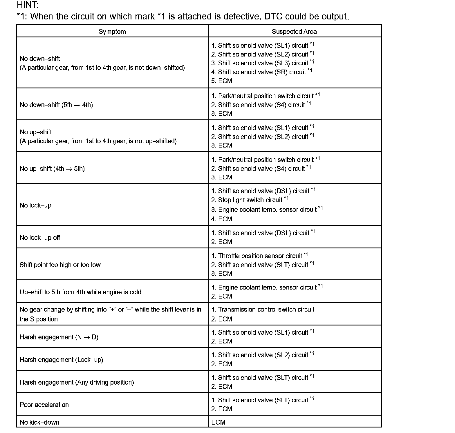 PROBLEM SYMPTOMS TABLEHINT: If a normal code is displayed during the diagnostic trouble code check although the trouble still occurs, check the electrical circuits for each symptom in the order given in the charts and proceed to the troubleshooting.