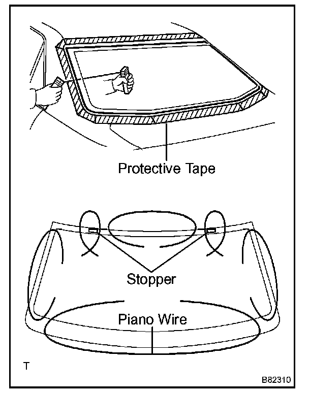 b. From the interior, insert piano wires between the vehicle body and back window glass as shown in the illustration.