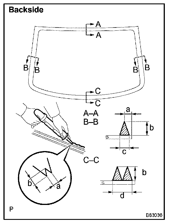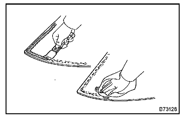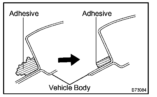 1. On the contact surface of the vehicle body, use a knife to cut away excess adhesive as shown in the illustration.